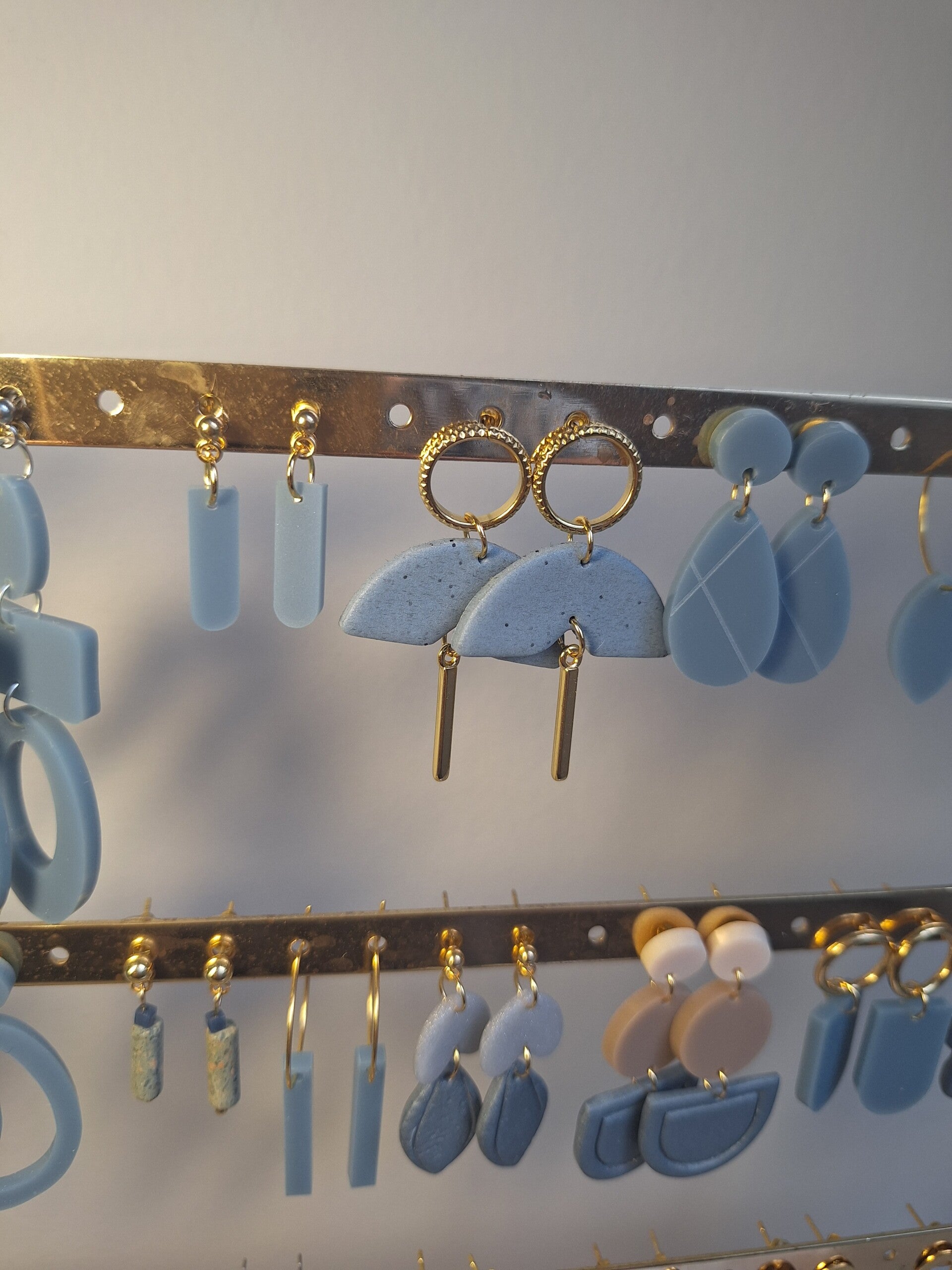 De oorbellen zijn verkrijgbaar in zowel kleine subtiele modellen als grotere statement oorbellen, zodat je altijd een stijl vindt die bij jou past. De combinatie van blauw en grijs tinten geeft een moderne, verfijnde uitstraling die makkelijk te combineren is met verschillende outfits.