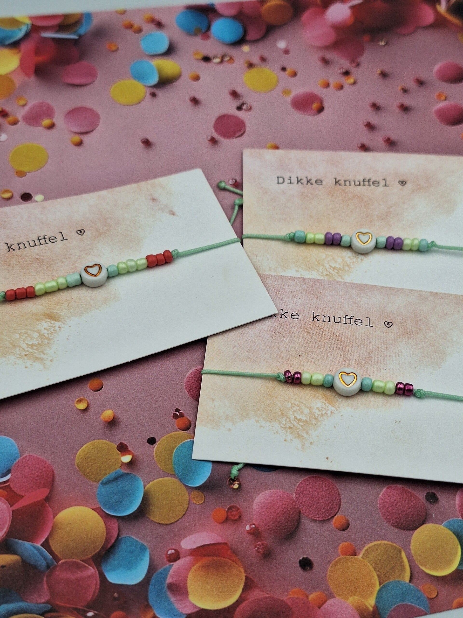 Deze armbandjes met schuifknoop en hartje zijn niet alleen stijlvol, maar ook praktisch doordat ze makkelijk verstelbaar zijn. Perfect als klein cadeautje voor een kinderfeestje, traktatie of als verrassing bij een verjaardag.