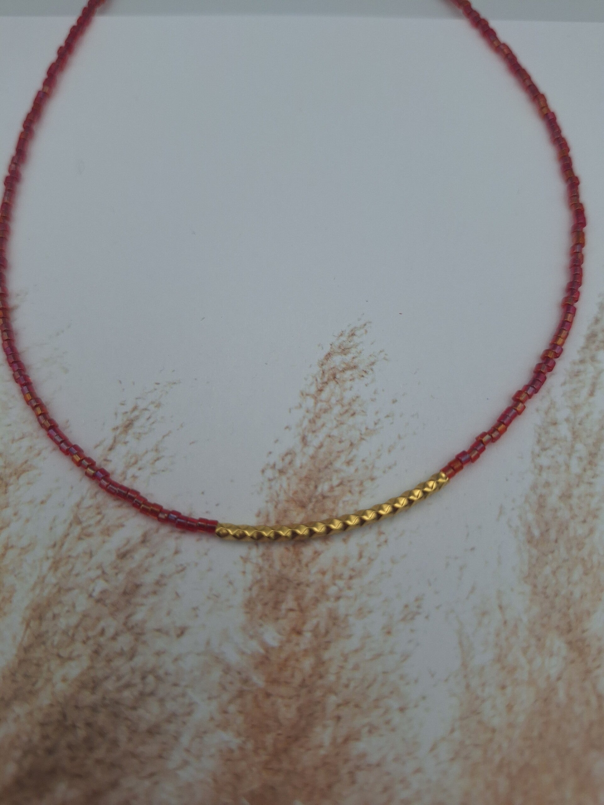 Voeg een vleugje kleur en elegantie toe aan je look met deze subtiele ketting van RVS en fijne Miyuki kralen in rood en goud. Het verfijnde ontwerp straalt stijl en warmte uit, perfect voor dagelijks dragen of een speciale gelegenheid.